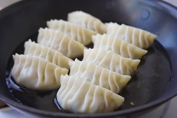 ⑤ フライパンに油をひき、②を並べる。湯または水を加え、蓋をして蒸し焼きにする。 水分がなくなってきたら蓋をとり、焼き色がつくまで焼く。