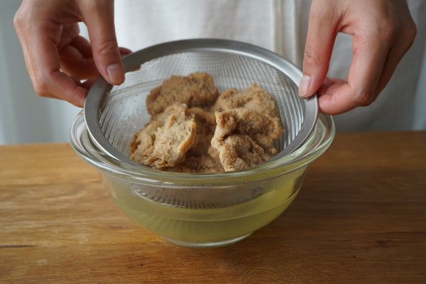 ① ソイミール(フィレ)は湯戻しして水気を絞り、縦半分に切る。