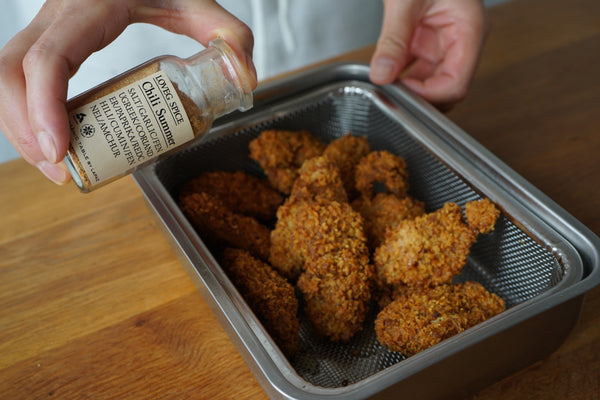 ソイパウダーをまぶしたザクザク食感のソイ唐揚げ。 仕上げのスパイスはぜひChile summerを合わせて。