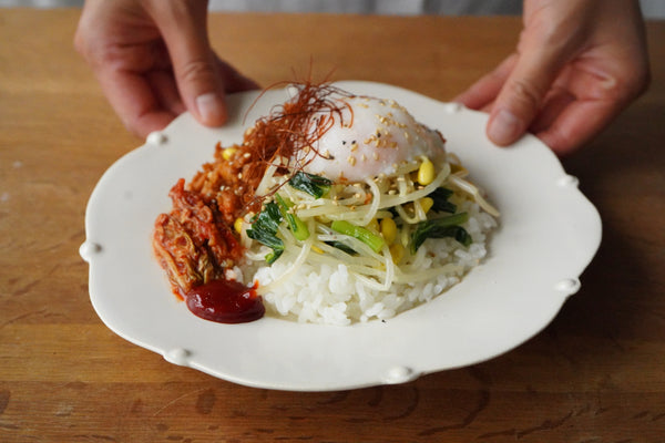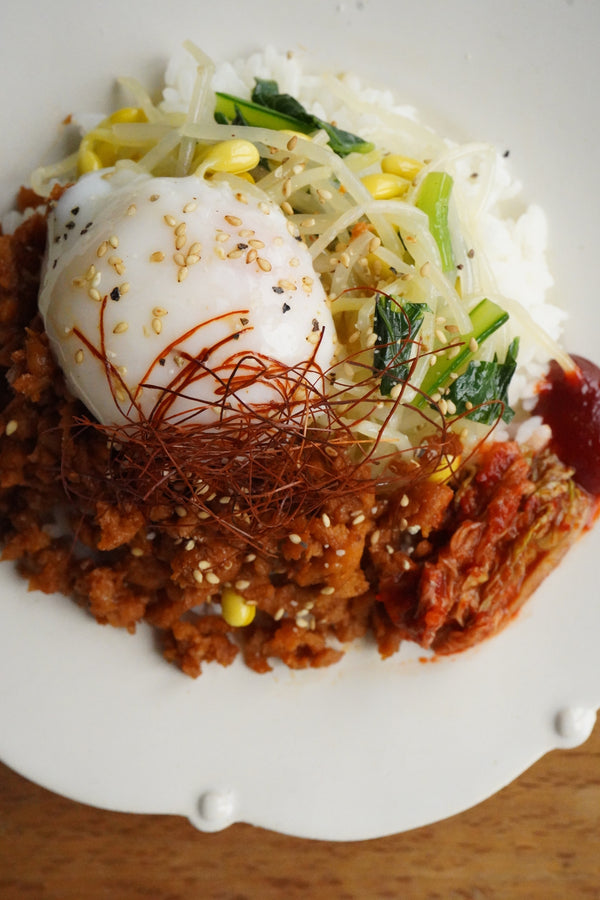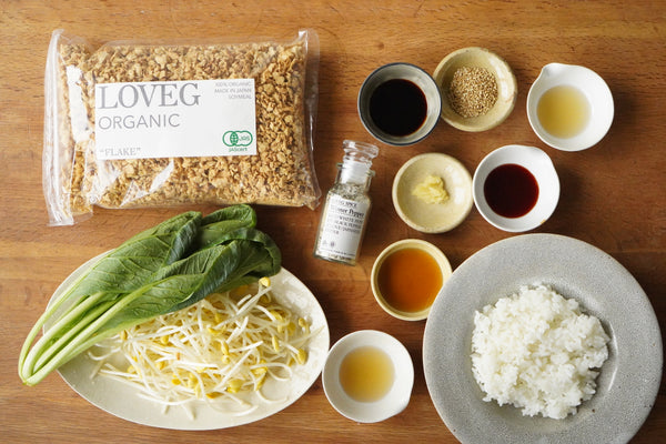 【材料:2人分】 LOVEGソイミール(フレーク) 30g 豆もやし 1/2袋 小松菜 1束 ★醤油 大さじ1 ★メープルシロップ 小さじ1 ★ごま油 小さじ1 ★コチュジャン 小さじ1 ★酒 小さじ1 ★にんにく(おろし) 小さじ1/2 ☆ごま油 小さじ1/2 ☆塩 少々 ごはん 茶碗2杯分 温泉卵、コチュジャン、キムチ、炒りごま お好み