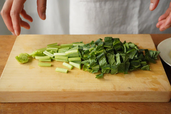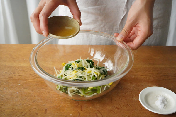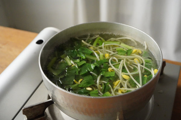 ③ 湯を沸かし、もやしと小松菜を茹でる。