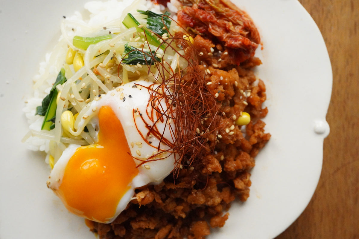 ⑤ 丼にご飯を盛り、②と①を盛る。お好みで温泉卵、コチュジャン、キムチを添え、ごまをふる。