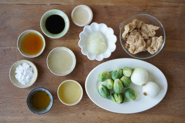 【材料:4人分】 LOVEGソイミール(フィレ) 40g 片栗粉 大さじ1 好みの野菜(新玉ねぎ、芽キャベツなど) 適量 ★おろし新玉ねぎ 大さじ2 ★醤油 大さじ1.5 ★酒 大さじ2 ★みりん 大さじ2 ★メープルシロップ 大さじ1 ★米酢 小さじ1 油 大さじ1 すりごま お好み