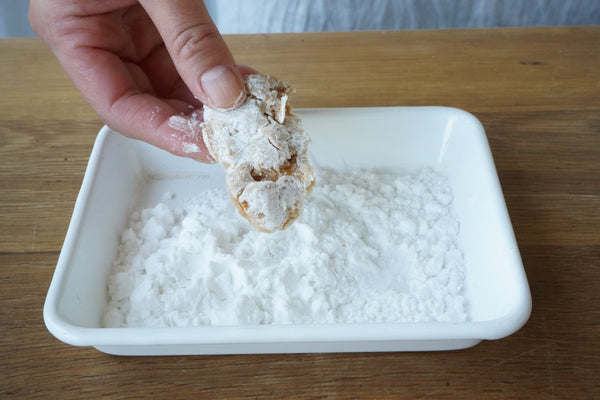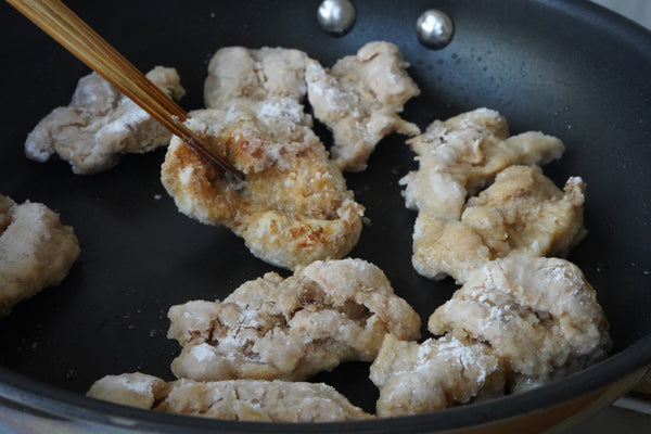 ① ソイミールは湯戻しして水気を絞る。大きいものは半分に切る。表面にうっすら片栗粉をふる。