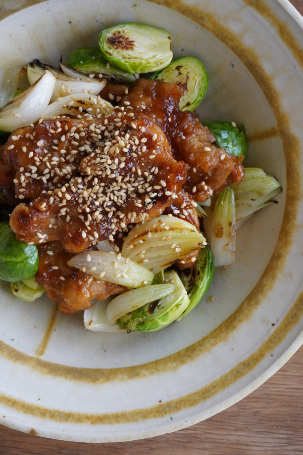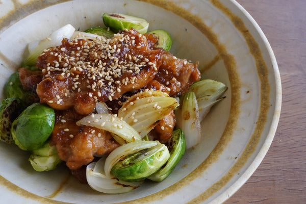 定番照り焼きのタレに、おろし玉ねぎを加えて優しい甘みに。 ソイミールのしっかりとした味付けと旬野菜の食感を楽しむ1皿。