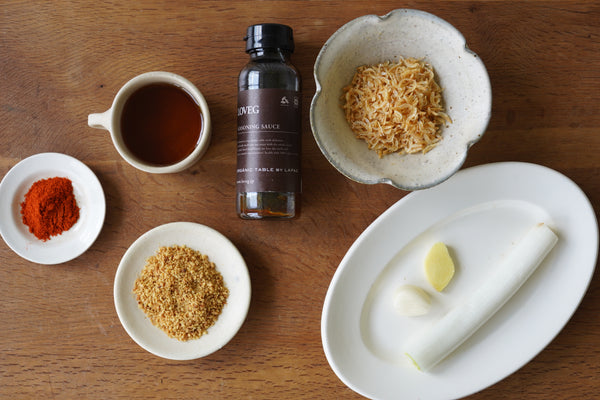 【材料:作りやすい分量】 ごま油 80ml ☆LOVEGソイミール(パウダー) 10g ☆乾燥小海老 10g ☆韓国唐辛子 小さじ1〜 ★にんにく 1片 ★生姜 1片 ★長ネギ 15cm LOVEGシーズニングソース 大さじ2