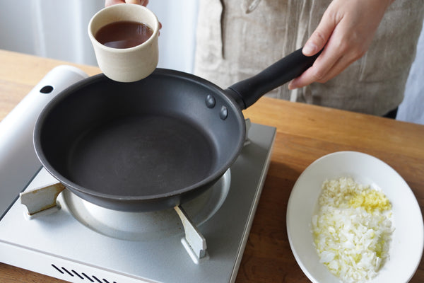 ③ 香りが出たら☆を入れて、一煮立ちしたらシーズニングソースを加えて火を止める。