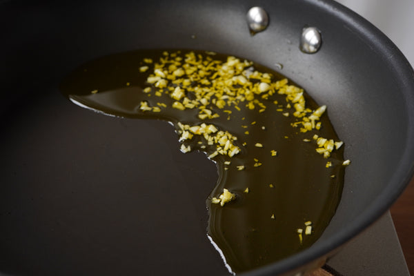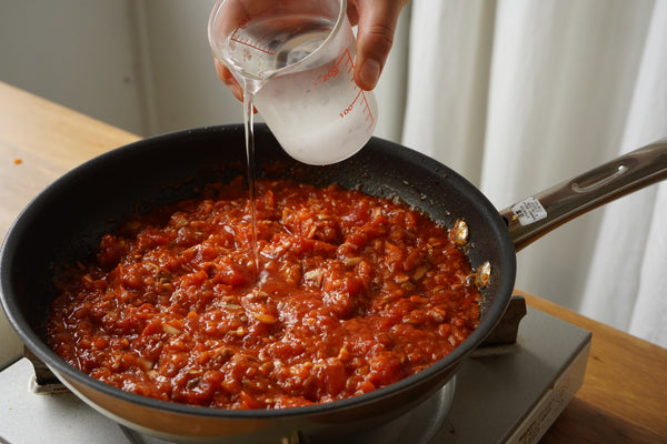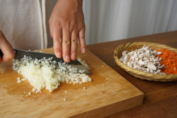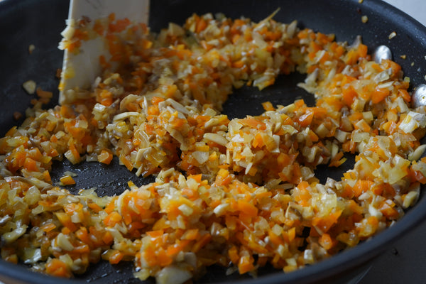 ・たっぷりの人参、玉ねぎ、マッシュルームにはうま味成分が豊富。野菜を焼き付けるように炒めることで旨みが出て、塩分控えめでもおいしく仕上がる。